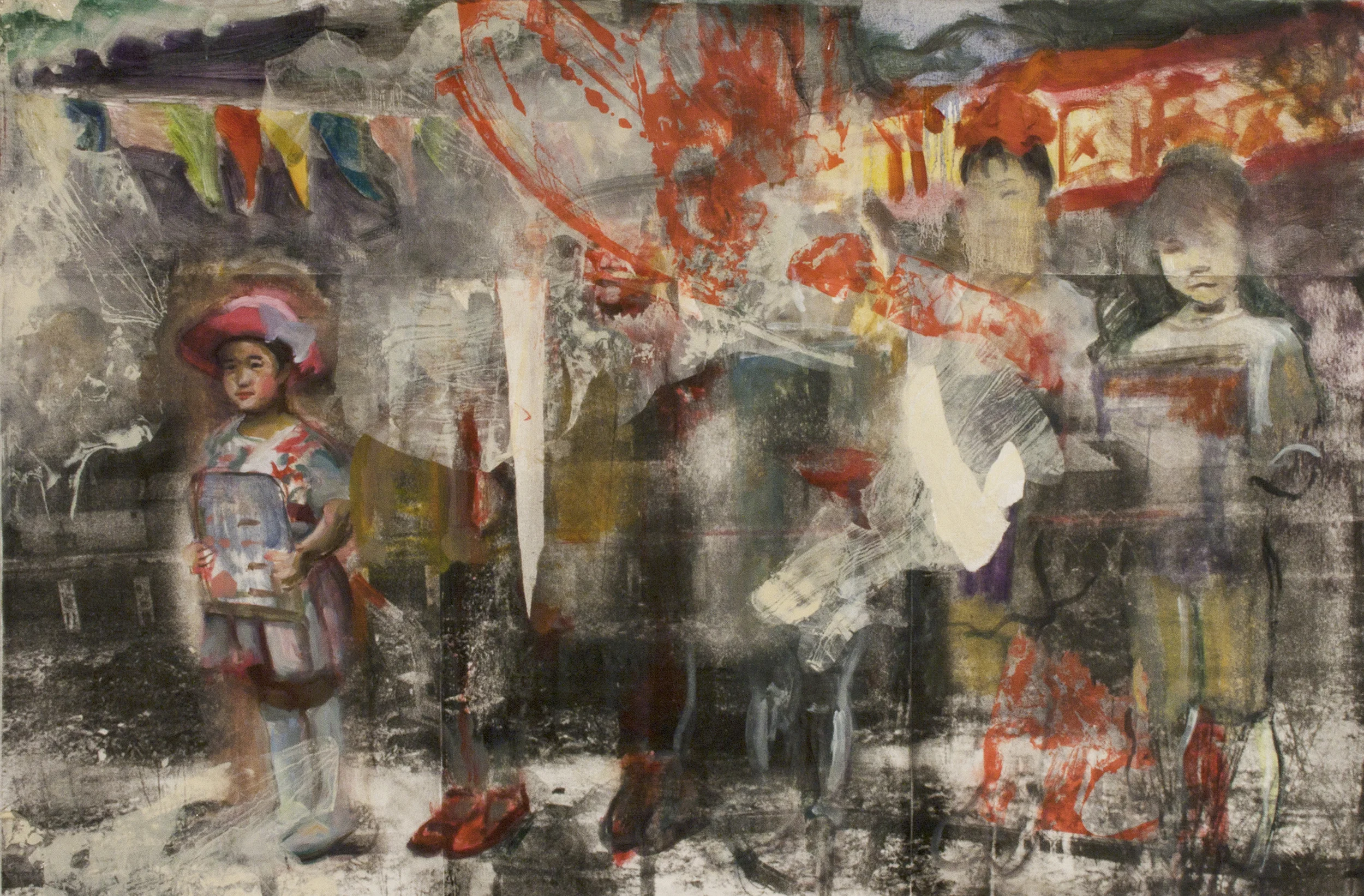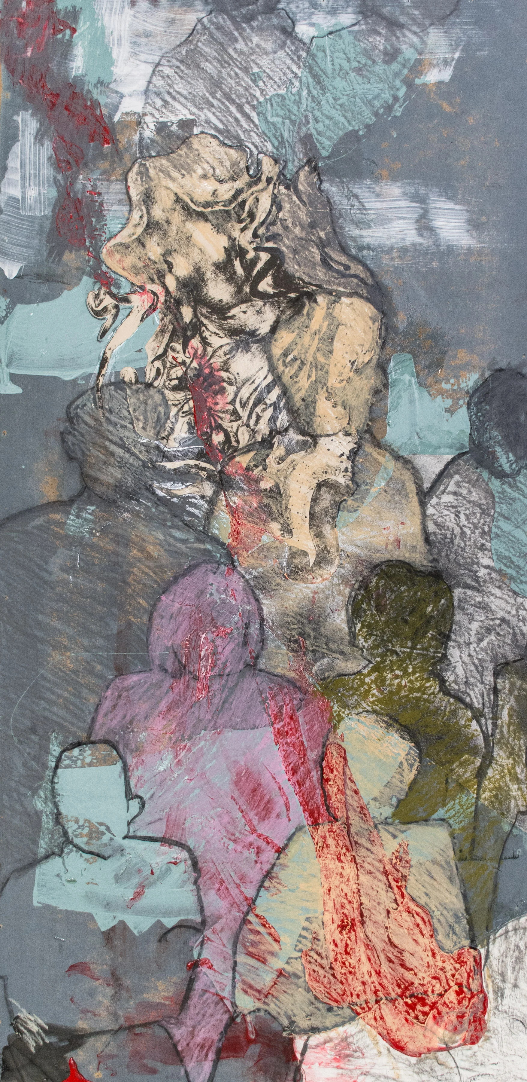 Figures , House paint, oil pastel and lithographic collage on panel, 18x39 inches, 2015
