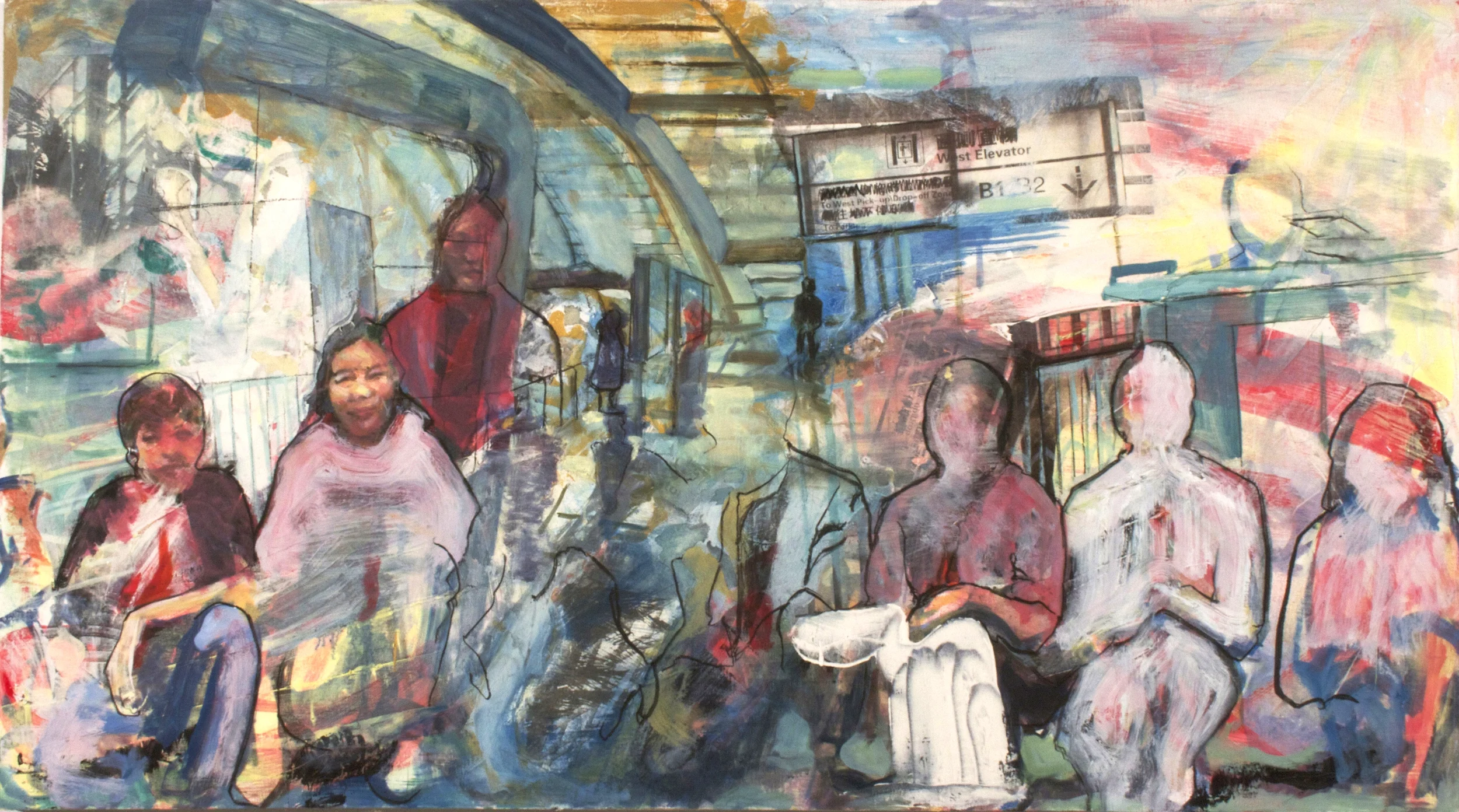 Departure . Oil, house paint, charcoal and silkscreen collage on linen, 3x6 ft. 2013